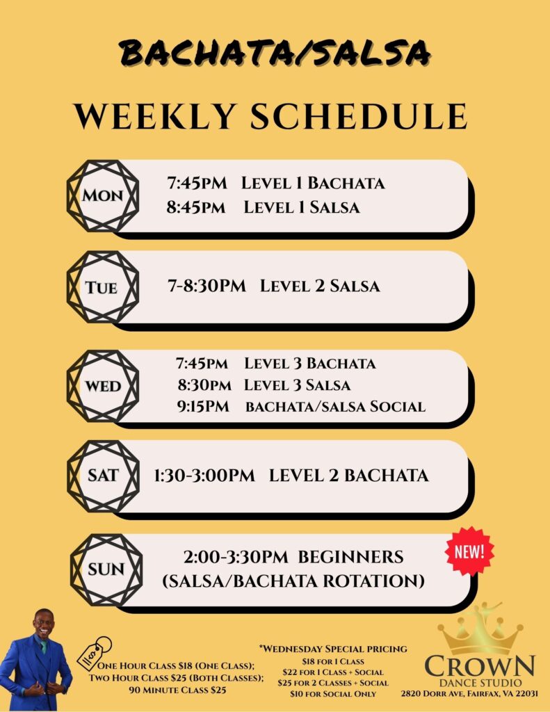 2:00 – 3:30 PM Beginners (Salsa/Bachata Rotation)