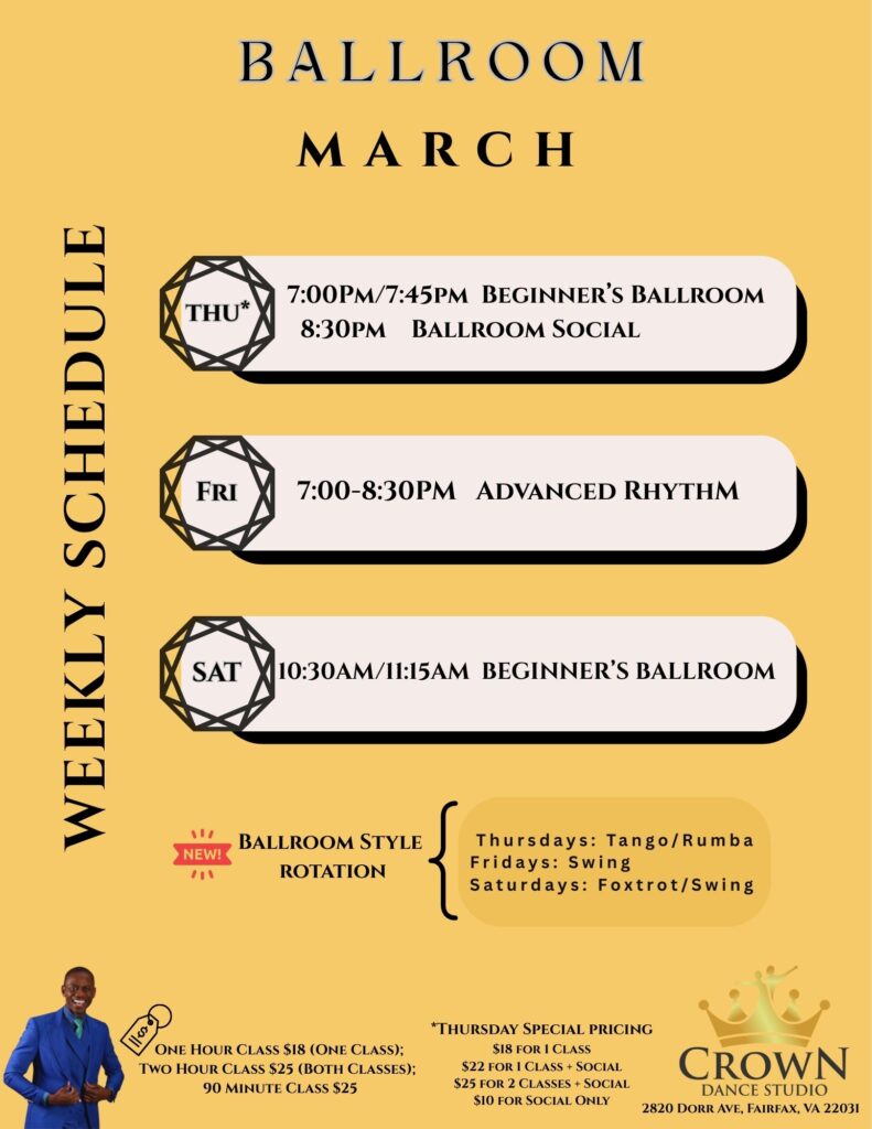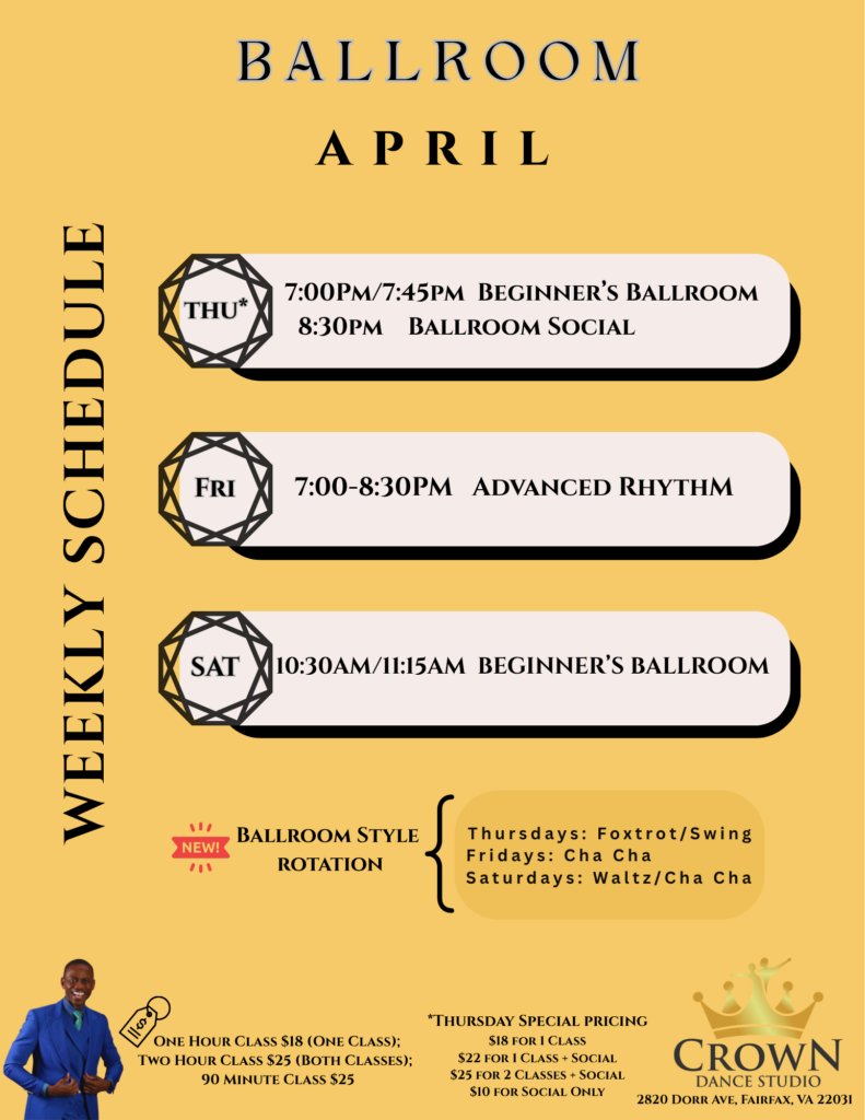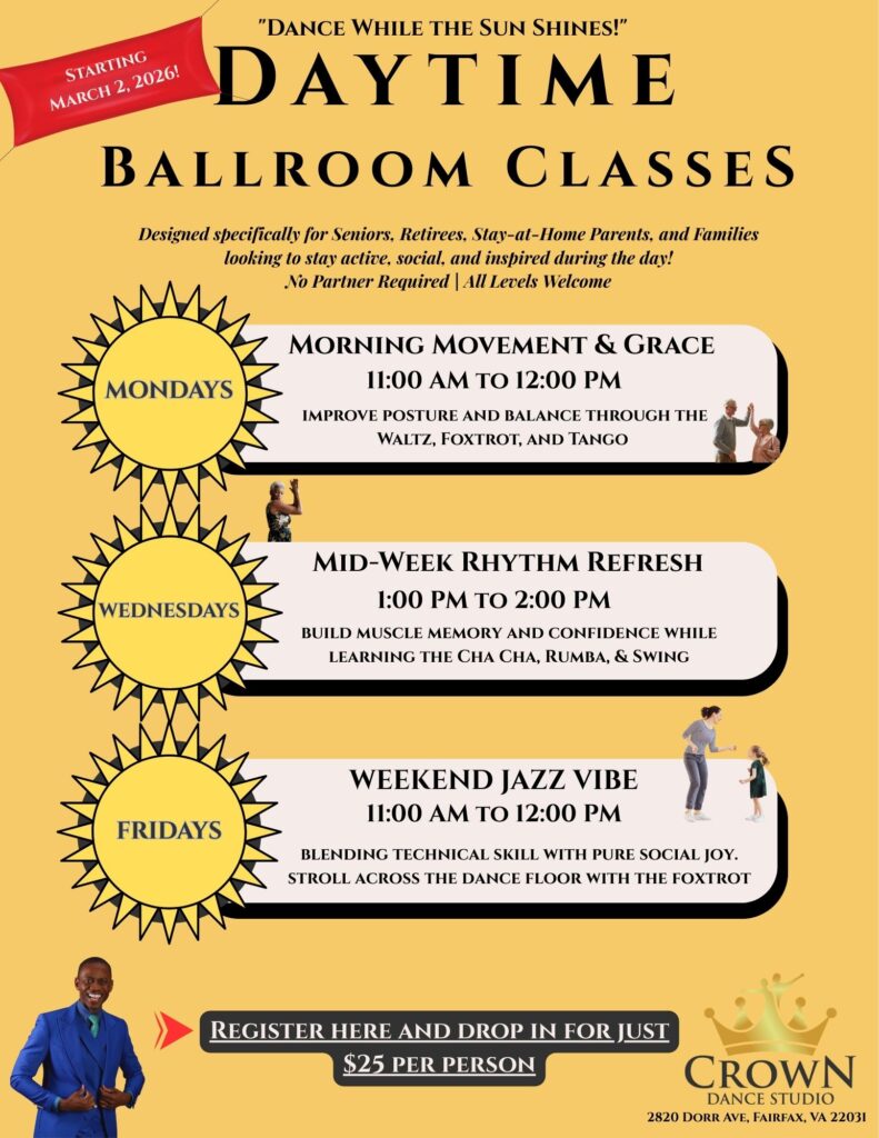 Join us for every Monday, Wednesday, and Friday for our new ballroom classes.